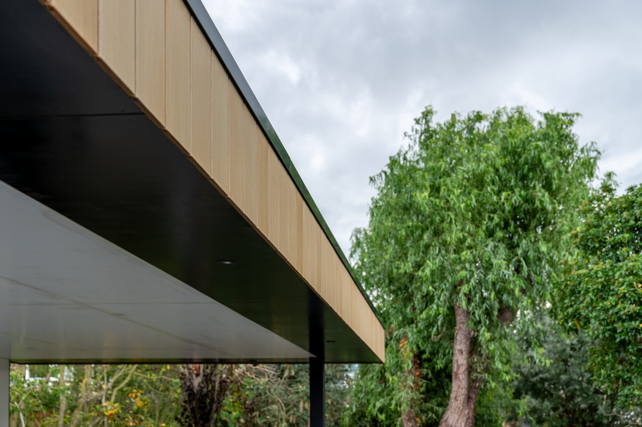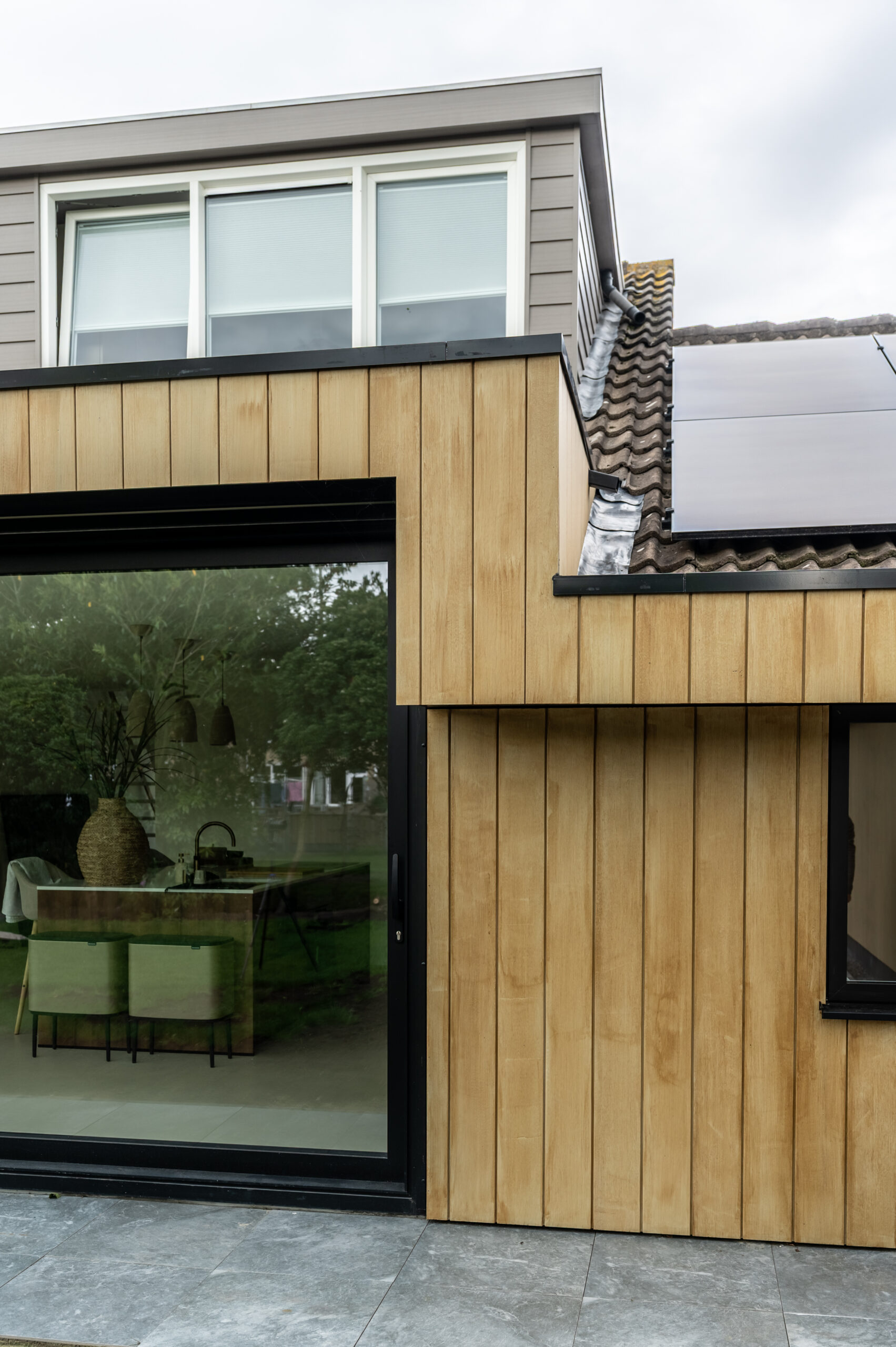 Aan de buitenzijde is gekozen voor een moderne, rustige uitstraling. De combinatie van houten gevelbekleding met donkere kozijnen en slanke constructieve elementen geeft karakter, Juist bij deze aanbouw in Vlissingen is dat belangrijk. U wilt een uitbreiding die past bij de woning, extra wooncomfort biedt en kwalitatief duurzaam is voor de toekomst.