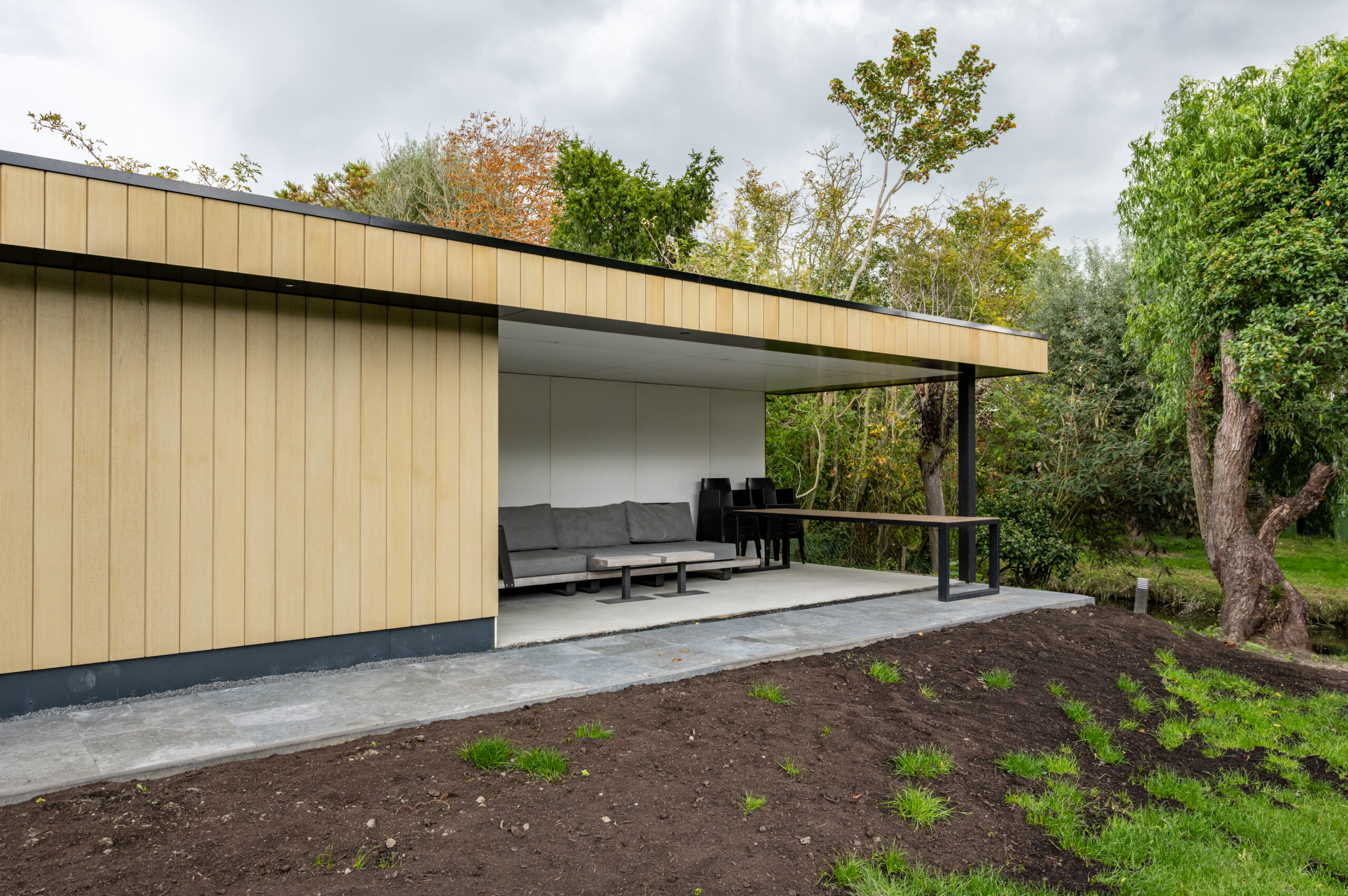 De stijl sluit bewust aan op de aanbouw. Houten bekleding, een strakke dakrand en slanke staanders zorgen voor een bijpassende uitstraling. De veranda voelt daardoor niet als een los element in de tuin, maar als een logisch vervolg op de aanbouw Vlissingen. Precies die samenhang zorgt voor een kloppend totaalplaatje.